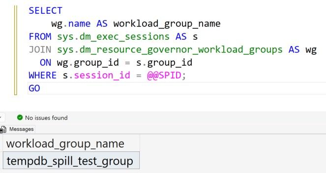 GOThis should return tempdb_spill_test_group as the workload group name.